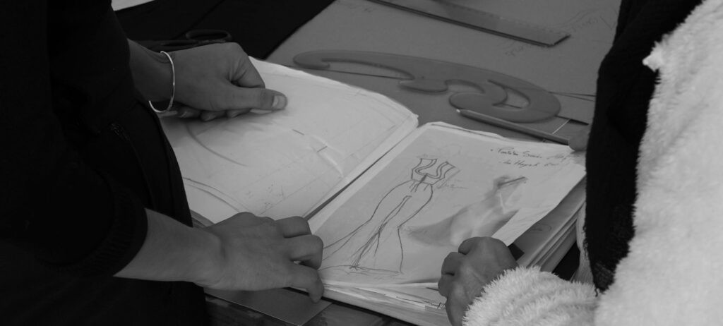 Once the design takes form, we open a dialogue with our couturières and artisans. Together, we explore techniques, fabrics, and details — discussing what is possible, what is new, and what remains eternal. This exchange bridges creative vision and craftsmanship, ensuring that every creation is both daring and impeccably made.