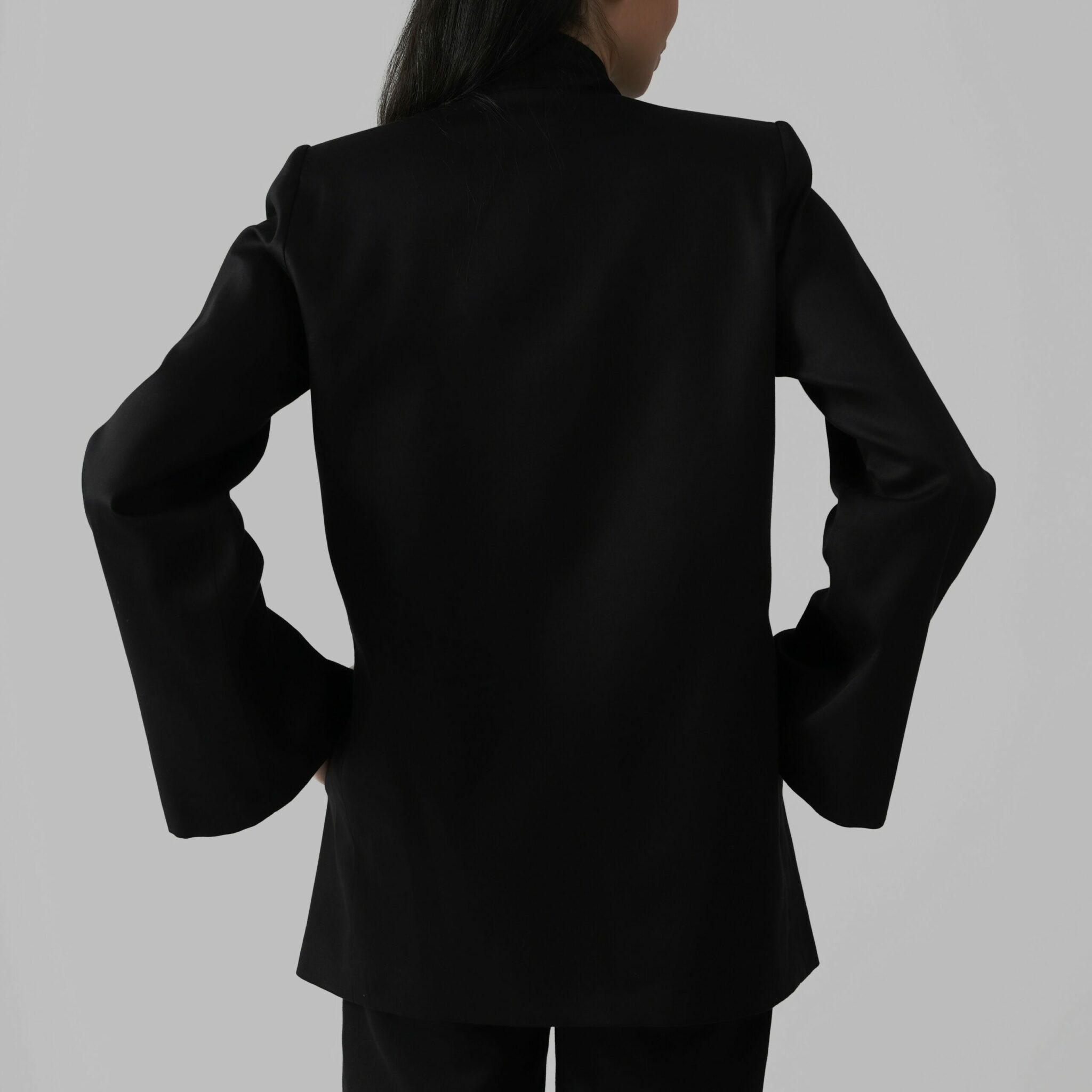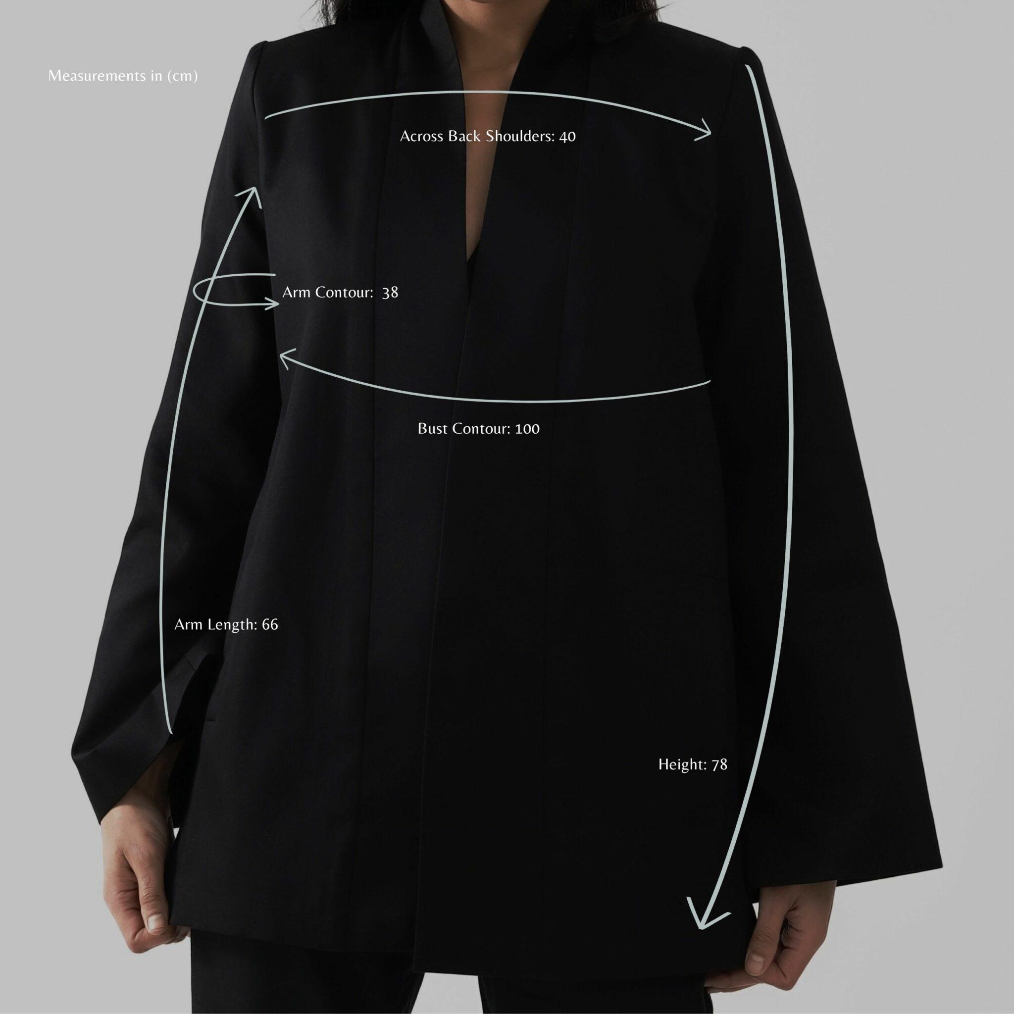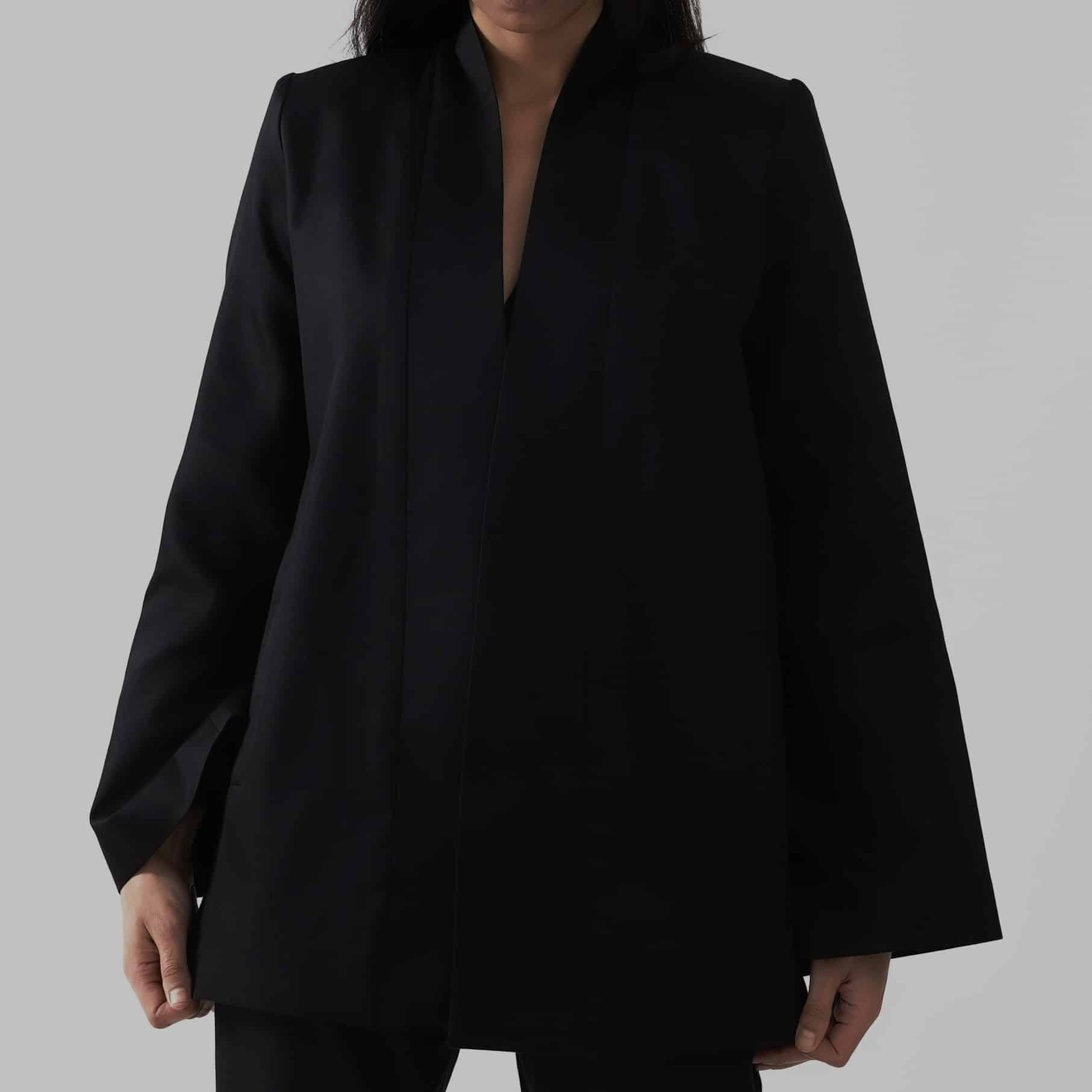 This signature vest is tailored from dense pure black cotton satin, defined by sculpted shoulders and elongated, architectural lines. Its minimalist open front is balanced by discreet side-tie closures that introduce subtle movement without disrupting the garment’s clean structure.