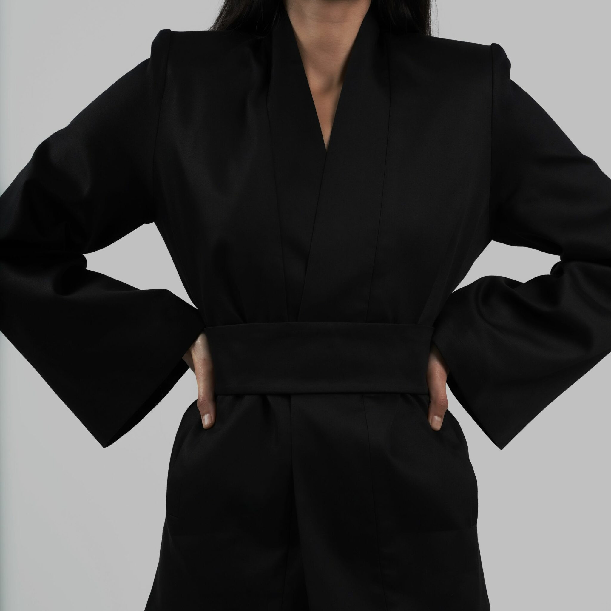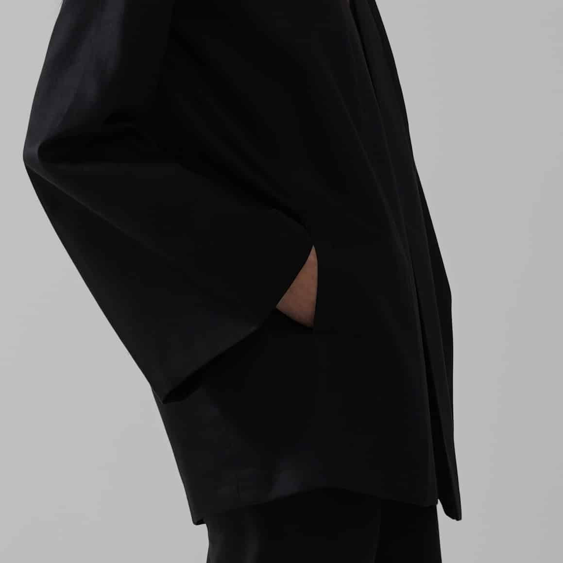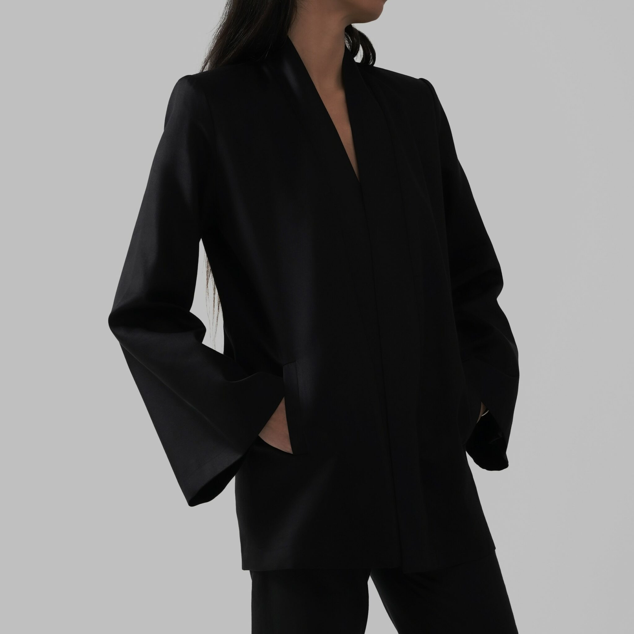 This signature vest is tailored from dense pure black cotton satin, defined by sculpted shoulders and elongated, architectural lines. Its minimalist open front is balanced by discreet side-tie closures that introduce subtle movement without disrupting the garment’s clean structure.